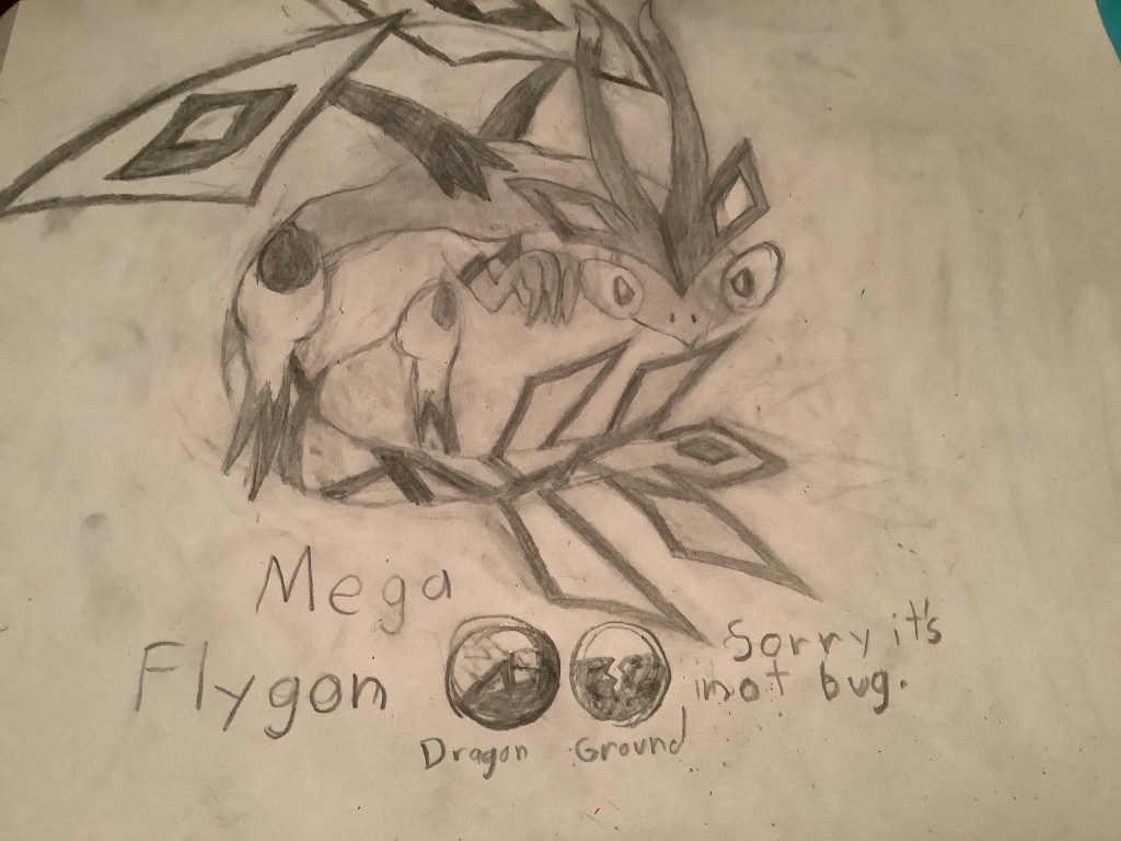 The only things that bother me about this is the wonky wings. I think the rest is brilliant. Flygon is a dragon Pokémon originally from the Hoen region. The elusive, fantastical beast flies through the desert. The humming of its wings apparently sounds like a woman singing. I already love Flygon, and in the style of Mega Pokémon, Flygon’s already existing features are emphasized and made “cooler.” What a great drawing.