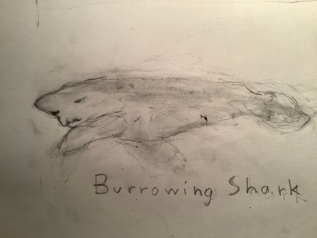My friend and I decided to each draw something cool and show it to each other. He made a Pokémon drawing (i don’t remember which pokemon it was,) and I made this. It is an underground shark. As being hydrodynamic (streamlined so water flows past easily, like a boat) is no longer a problem, its body is more lumpy. It’s sensitive nose is made for smelling out small tidbits in the soil for nomming on. The nose also shoves dirt down towards the fins to be compacted. The overlapping scales on this shark are very large for the shark’s size. They keep the shark anchored as it digs into the soil. Its front (pectoral) fin has been specialized for shoving dirt down and into the tunnel floor. The caudal fin ungulates back and forth as it does with regular sharks, moving the shark steadily along. The back (dorsal) fin and other fins have disappeared, as they would dig into the dirt and slow the shark down. The shark has developed lungs to breathe air. It needs less oxygen and food than many other sharks because it is small- only seven inches long, slightly smaller than an adult hand. It is eaten by mammals that hunt other burrowing animals.