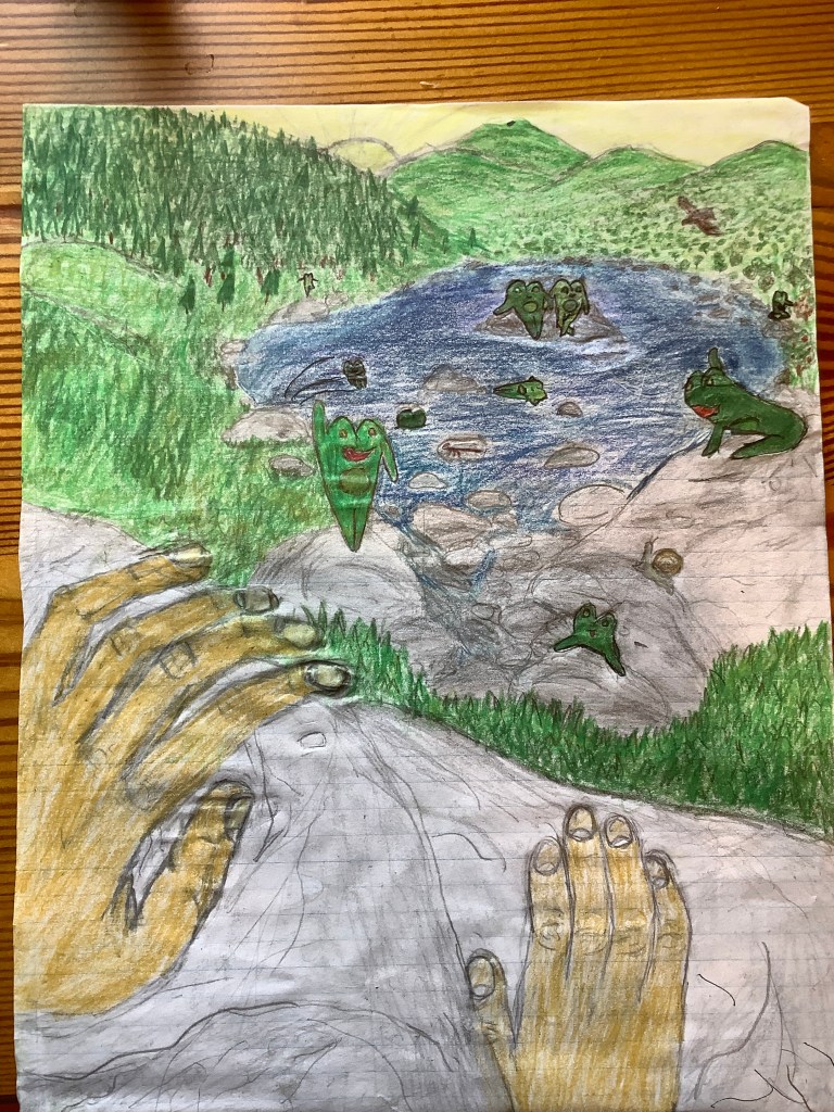 Recently, I have not recently drawn anything neat, so I went back to a past drawing and took a picture of it. This is one of two of my big drawings that took a long time. I made it two years ago. It is of a small child looking over a rock and seeing the frog people. Most of the frogs are children. The two parents are in the middle. There are a lot of ways I could have made it better, but it is still a nice drawing.