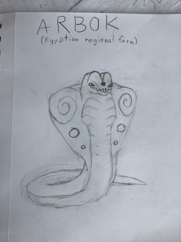 I also made a few adjustment to his body shape. His tail is now segmented in a way more similar to the original Arbok. There are new red patterns in the spirals on his… cobra.. flap… thingies. I changed the design of his forehead and neck, which I think makes it look more threatening.
