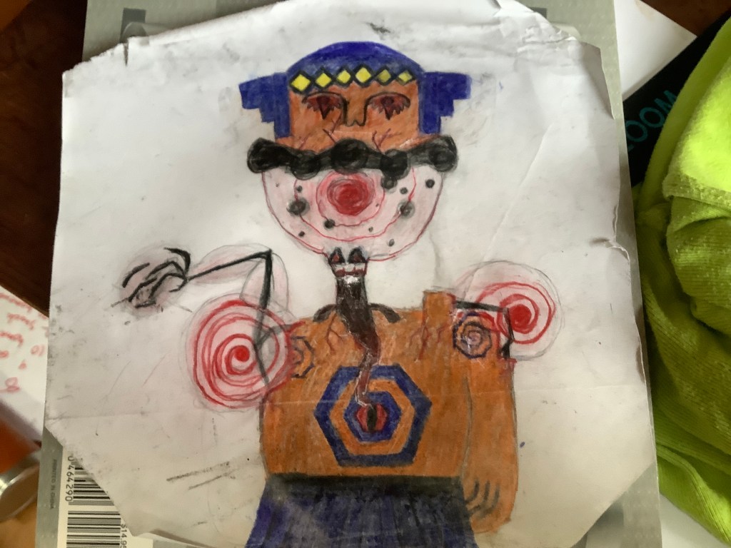 I imagine this drawing as part of a video game cutscene. The concept behind this one is that it was originally a statue belonging to an unknown ancient civilization. The nasty demon- things that have been following your protagonist throughout the game lurk around the palace that houses these spirits, so you have made your way through to destroy the boss, the one that’s been generating more creatures. As you travel along, you reach the great throne room, with ancient, broken statues lining the walls, and look up to see a silent chair. Suddenly, a crushing crack is heard as one of the statue’s heads breaks off, then slowly rises as the demon emerges. To make up for the statues missing arm and shoulders, the creature grows parts of its own, which crackle and crunch in small spasms as they are made,. Then, the creature begins the attack.